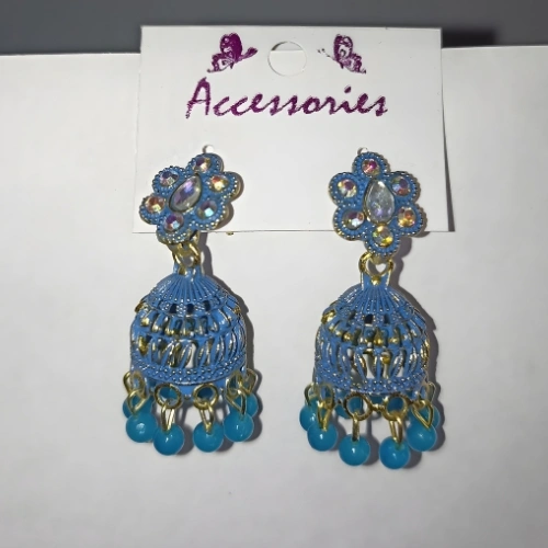 • Elegant Sky-Blue Floral Dome Jhumka Earrings with Intricate Petal Detailing